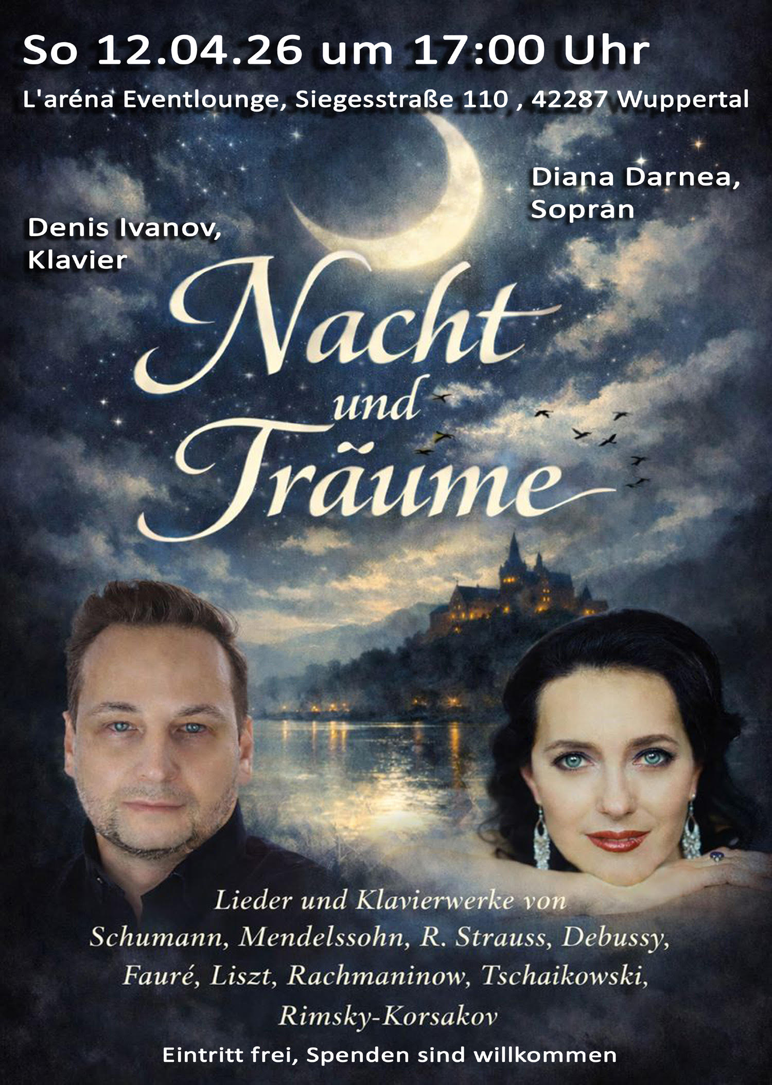 Am 12. April 2026 um 17:00 Uhr laden die Sopranistin Diana Darnea und der Pianist Denis Ivanov zu einem stimmungsvollen Liederabend in die L’aréna Eventlounge in Wuppertal ein. Unter dem Titel „Nacht und Träume“ erwartet das Publikum eine musikalische Reise durch die romantische und impressionistische Klangwelt der großen Liedkomponisten.